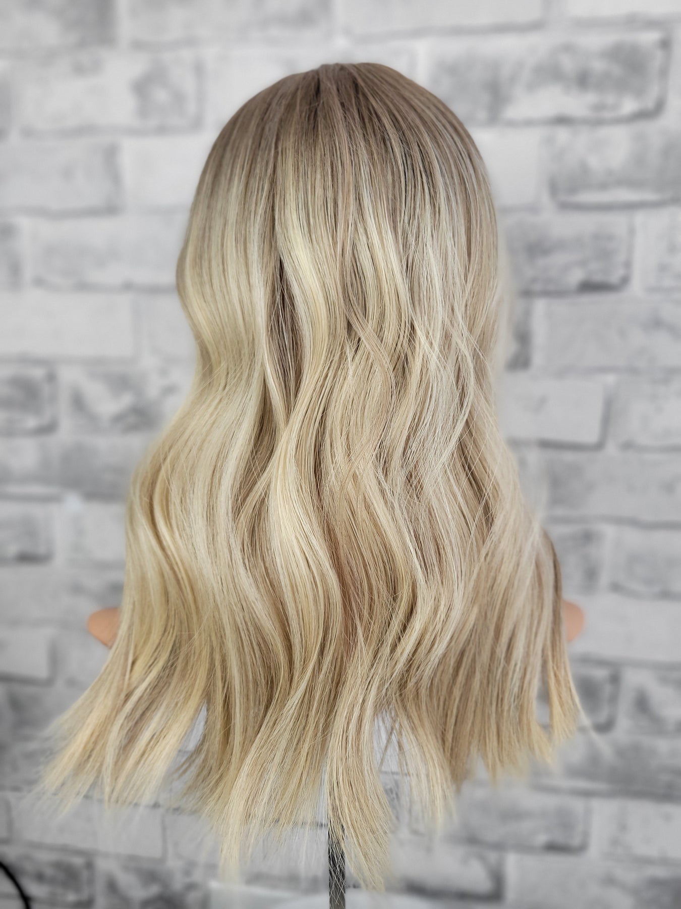 Medium blonde soft beige roots blended into a beachy sun toned muted blonde with medium blonde lowlights throughout.