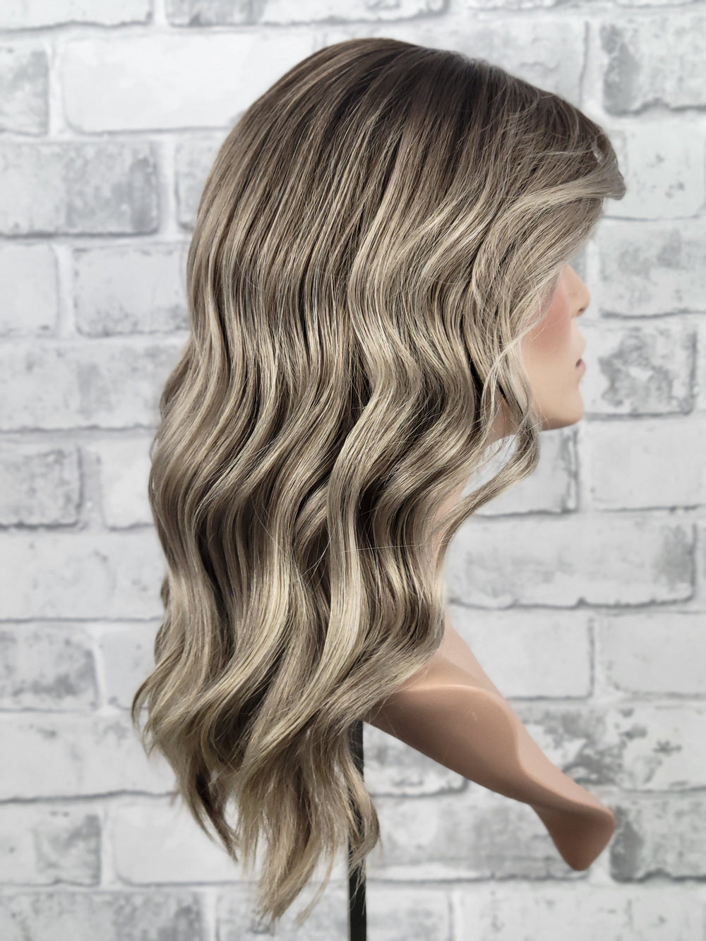 COLOUR: level 3 roots blended into an ashy cool toned dimensional light blonde. This piece is hand-colored on a blonde base. Please note that certain colors may develop slight variations, which will naturally fade over time. While not all pieces will exhibit discoloration, it may be more noticeable if the hair is styled pin-straight. Blonde shades may require periodic touch-ups depending on wear and washing frequency to maintain their vibrancy. Please reach out with any questions regarding colour!